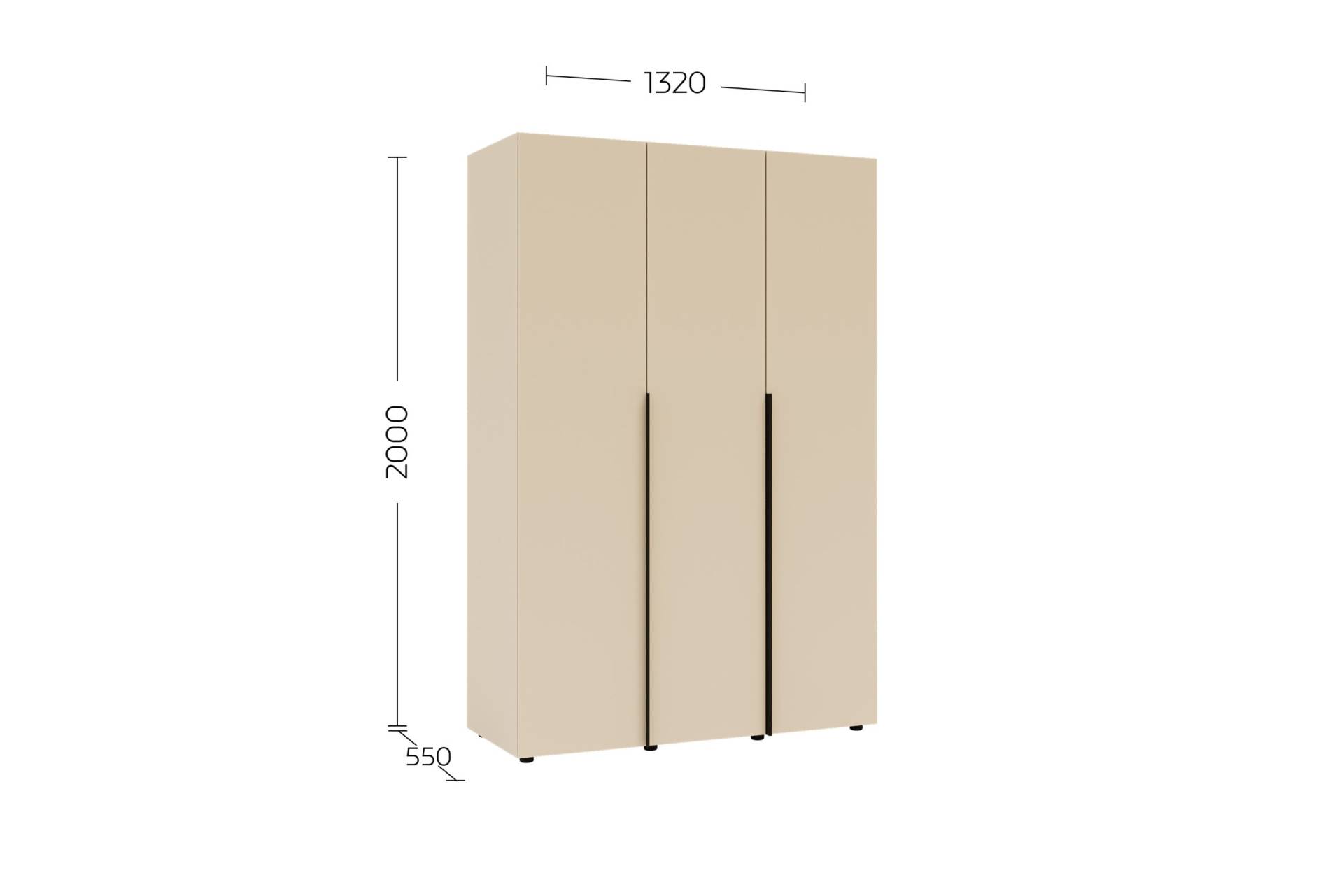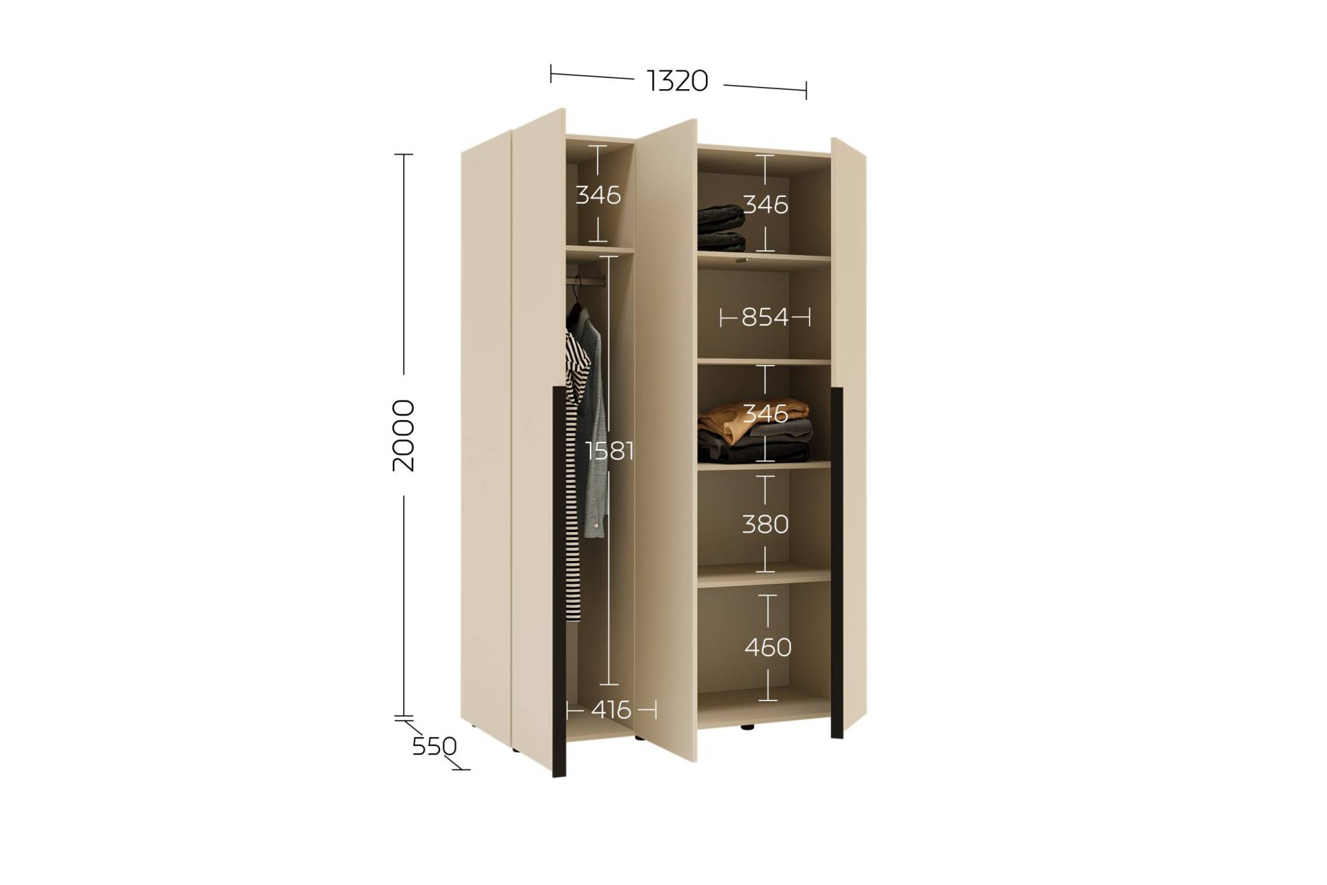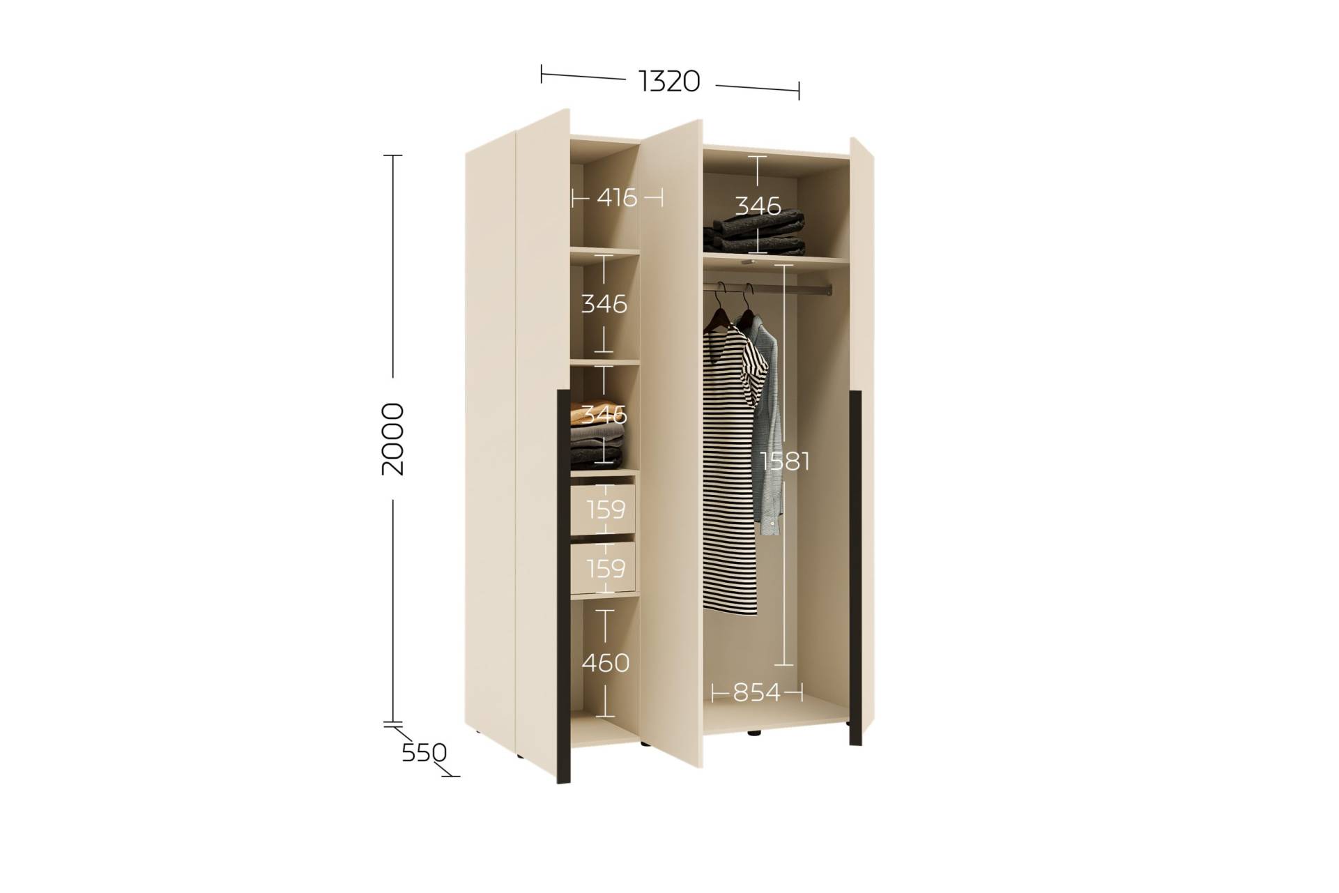 • Розміри: висота 2000 мм, ширина 1320 мм, глибина 550 мм
