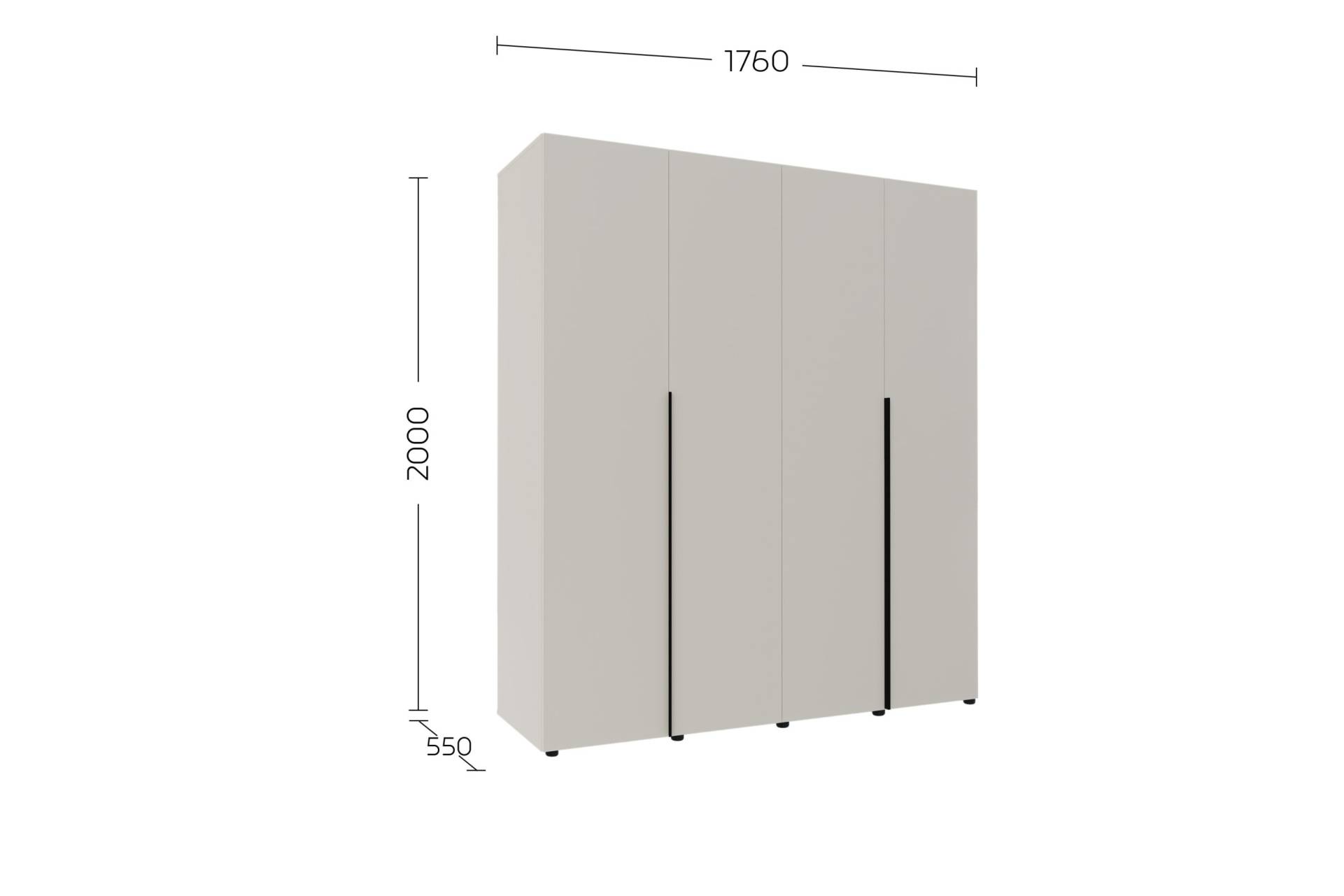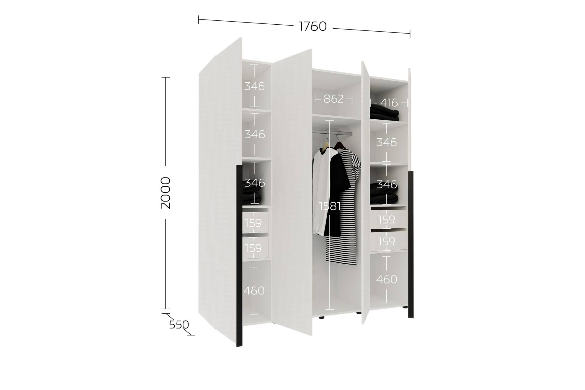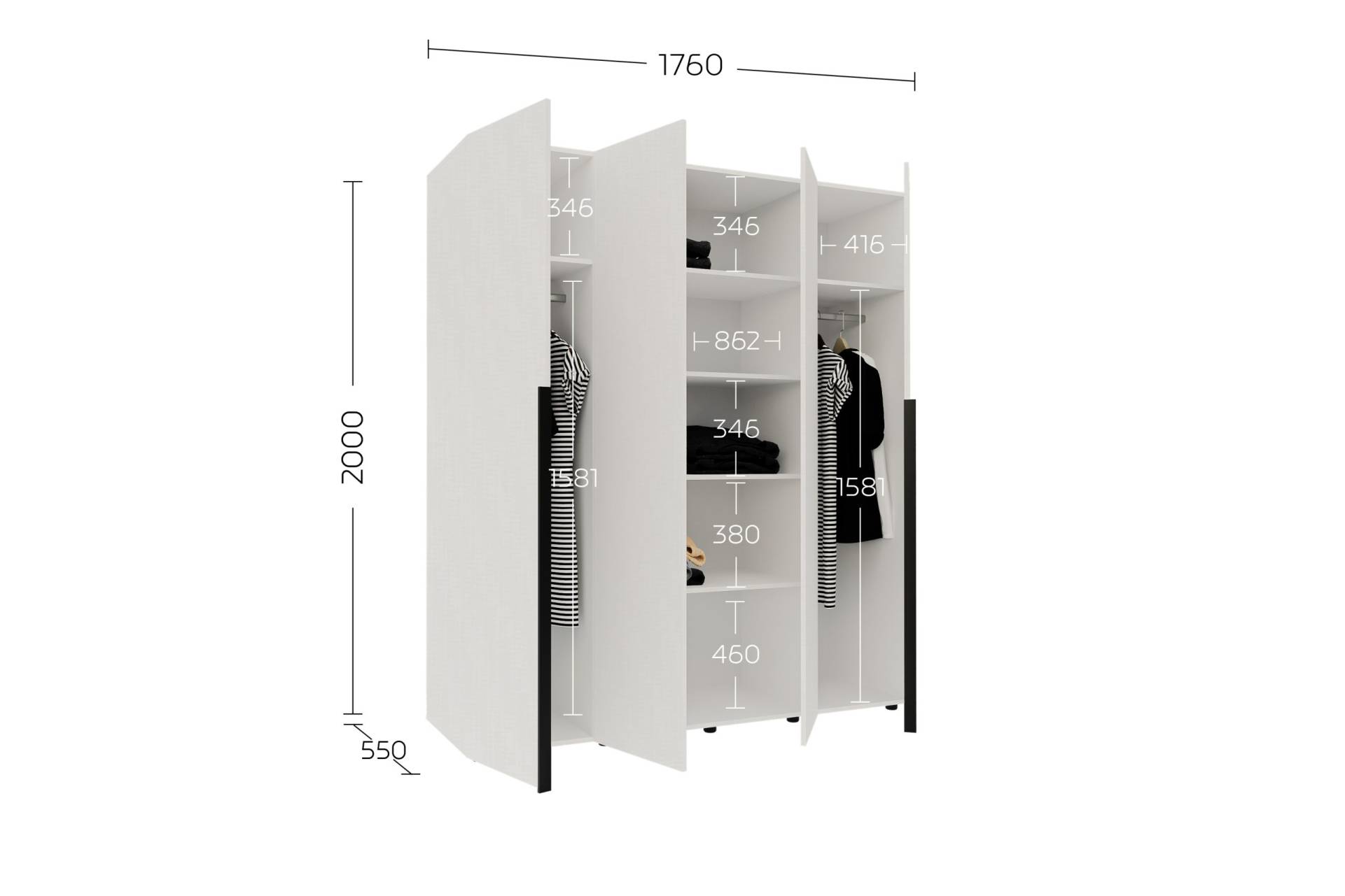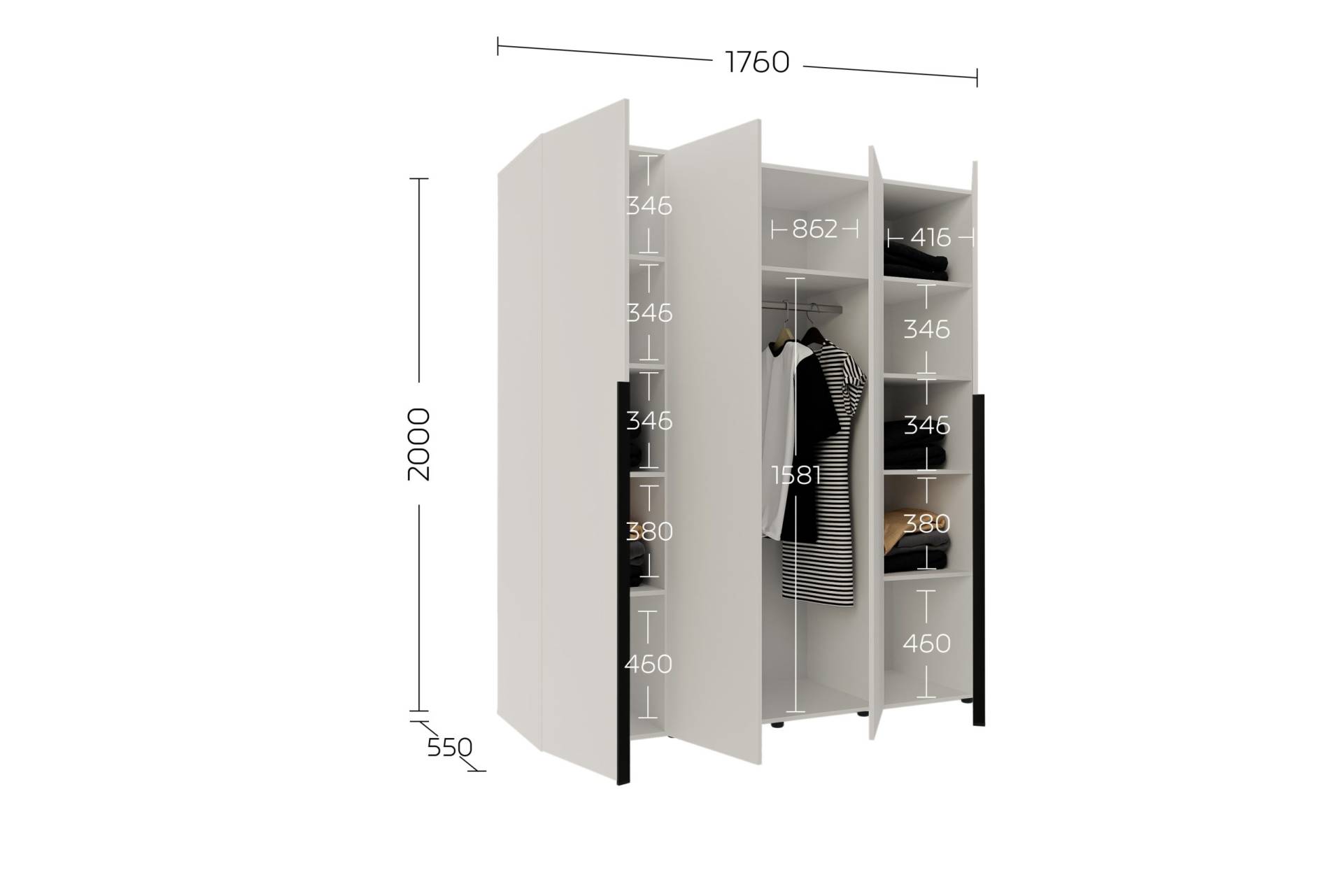 • Розміри: висота 2000 мм, ширина 1760 мм, глибина 550 мм