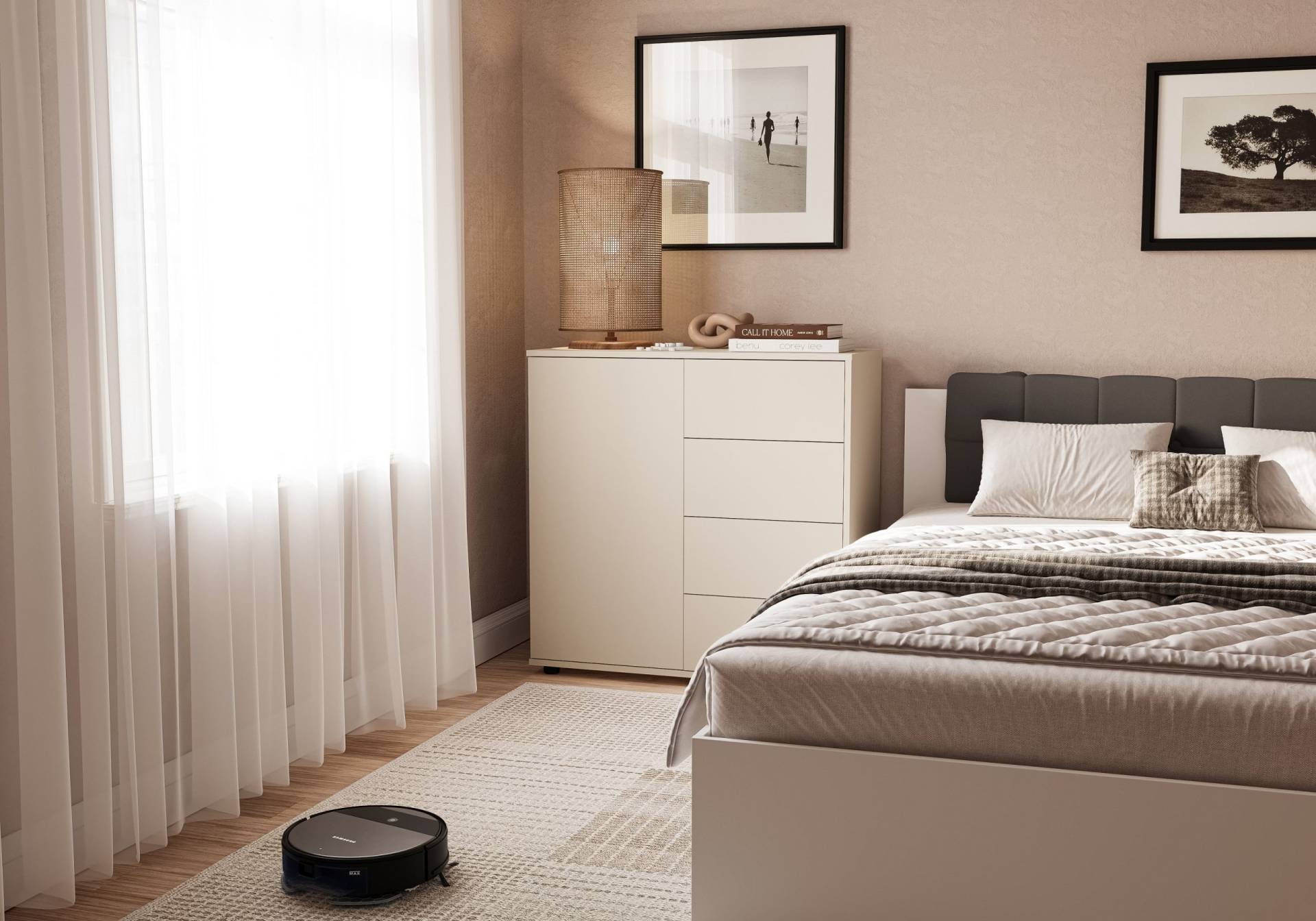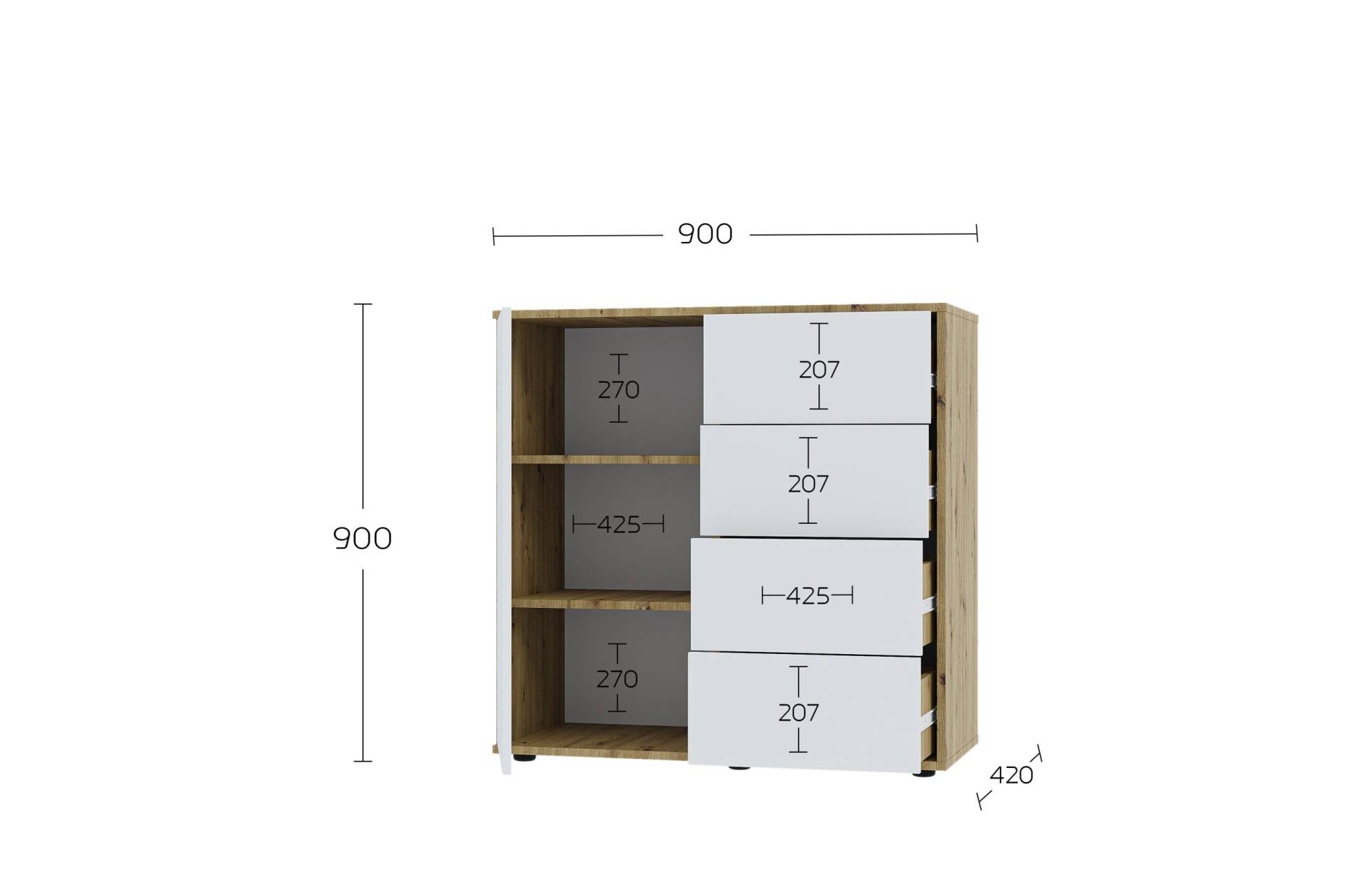 Модель оснащена одной дверцей на петлях и четырьмя вместительными ящиками с телескопическими направляющими, которые гарантируют плавное и бесшумное выдвижение. Система Push to Open позволяет открывать ящики легким нажатием — без ручек, что подчеркивает минималистичный вид комода.