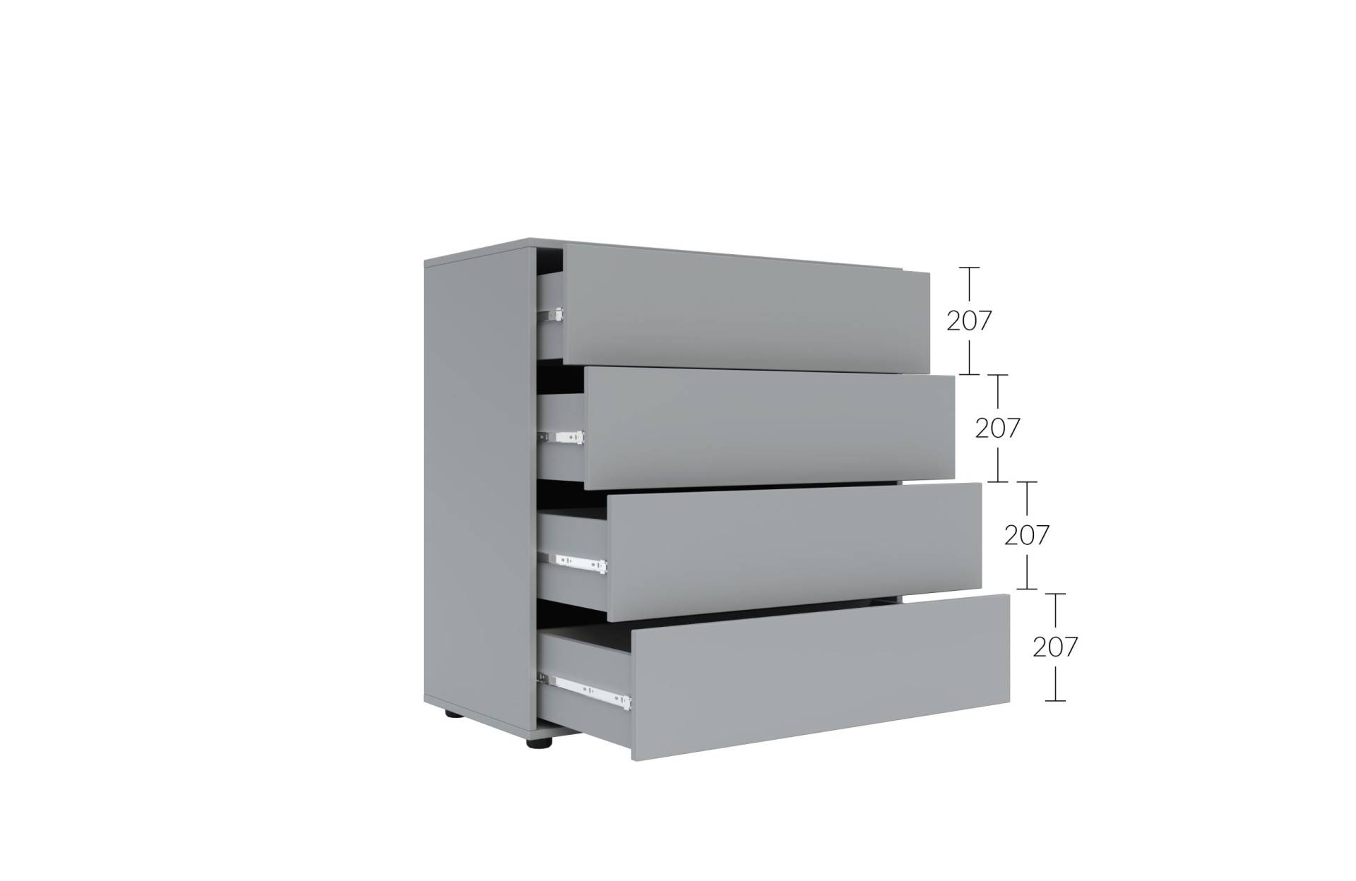 Комод оснащен четырьмя вместительными ящиками с телескопическими направляющими, которые обеспечивают плавное и надежное выдвижение. Система Push to Open позволяет открывать ящики легким нажатием, без использования ручек.
