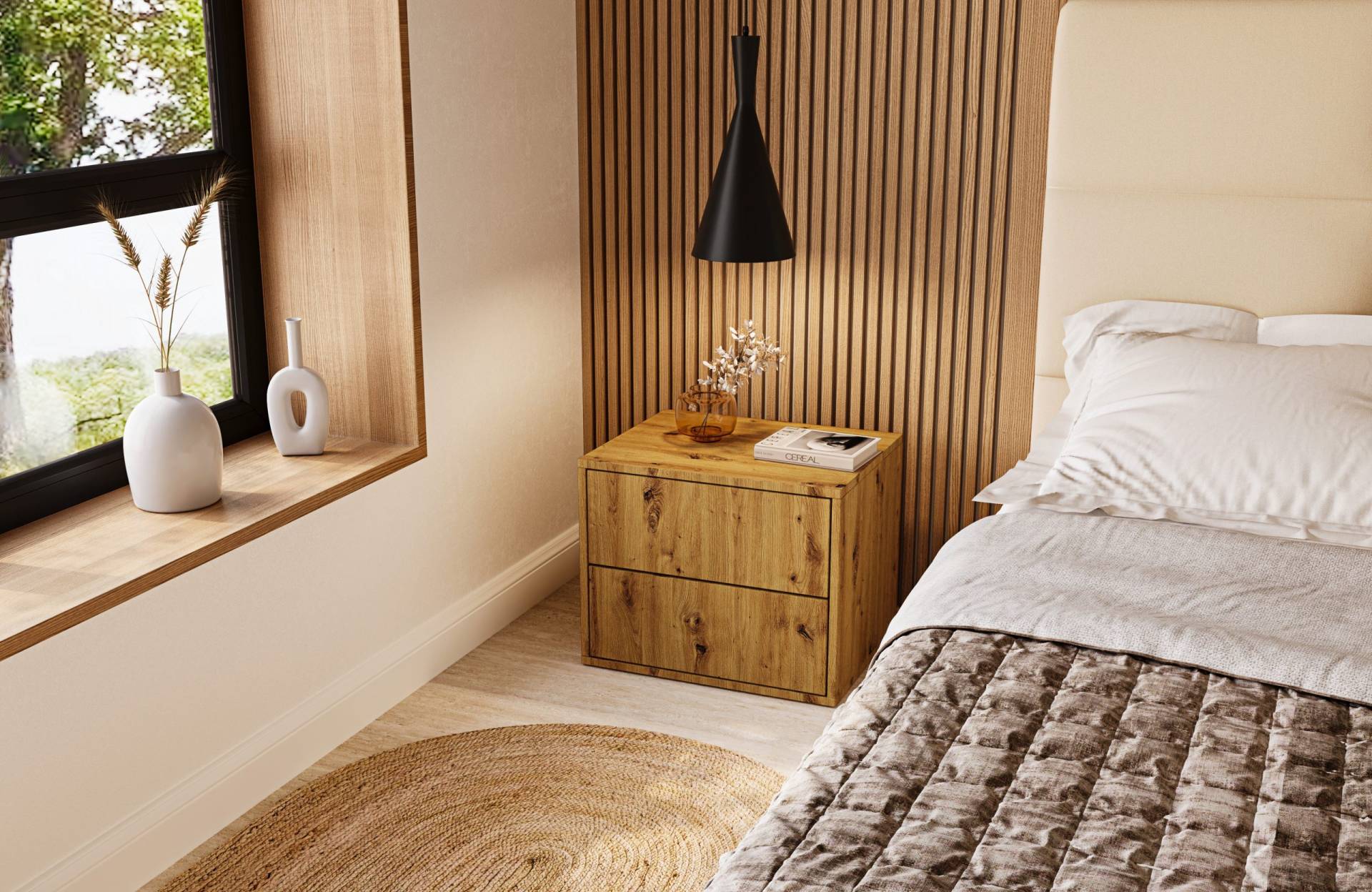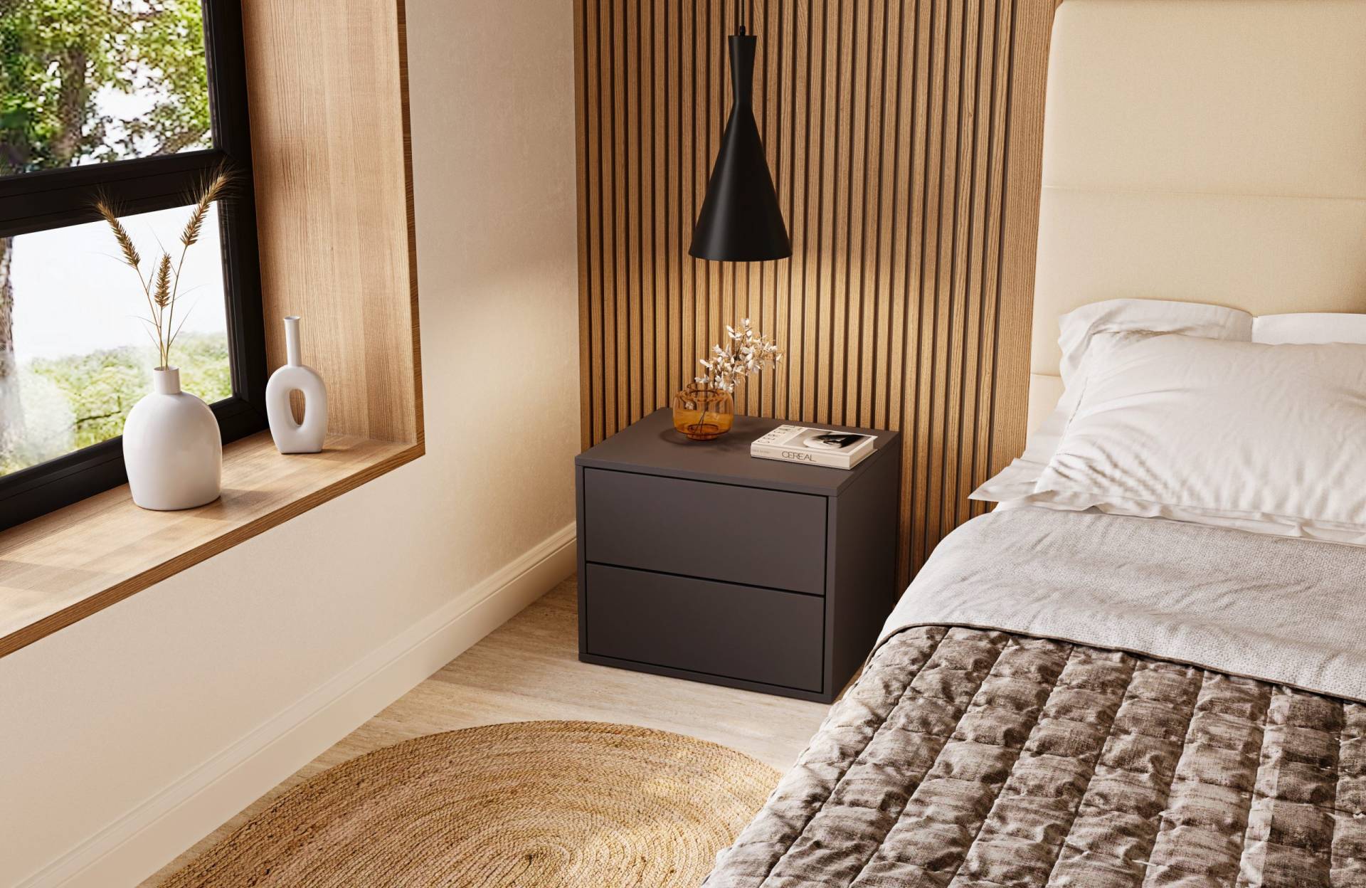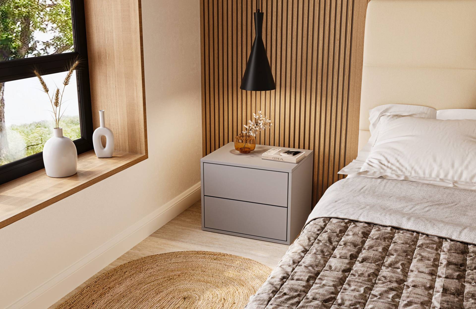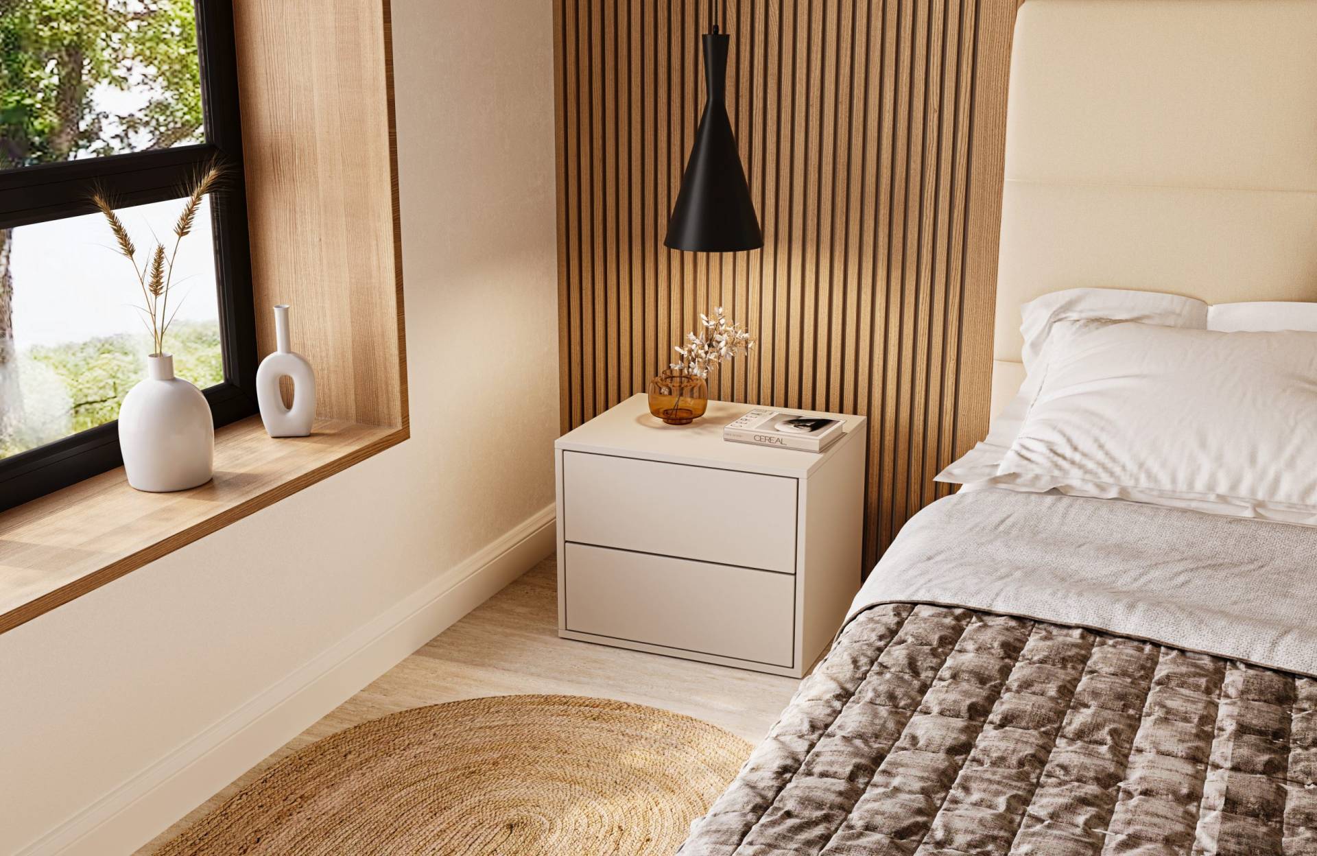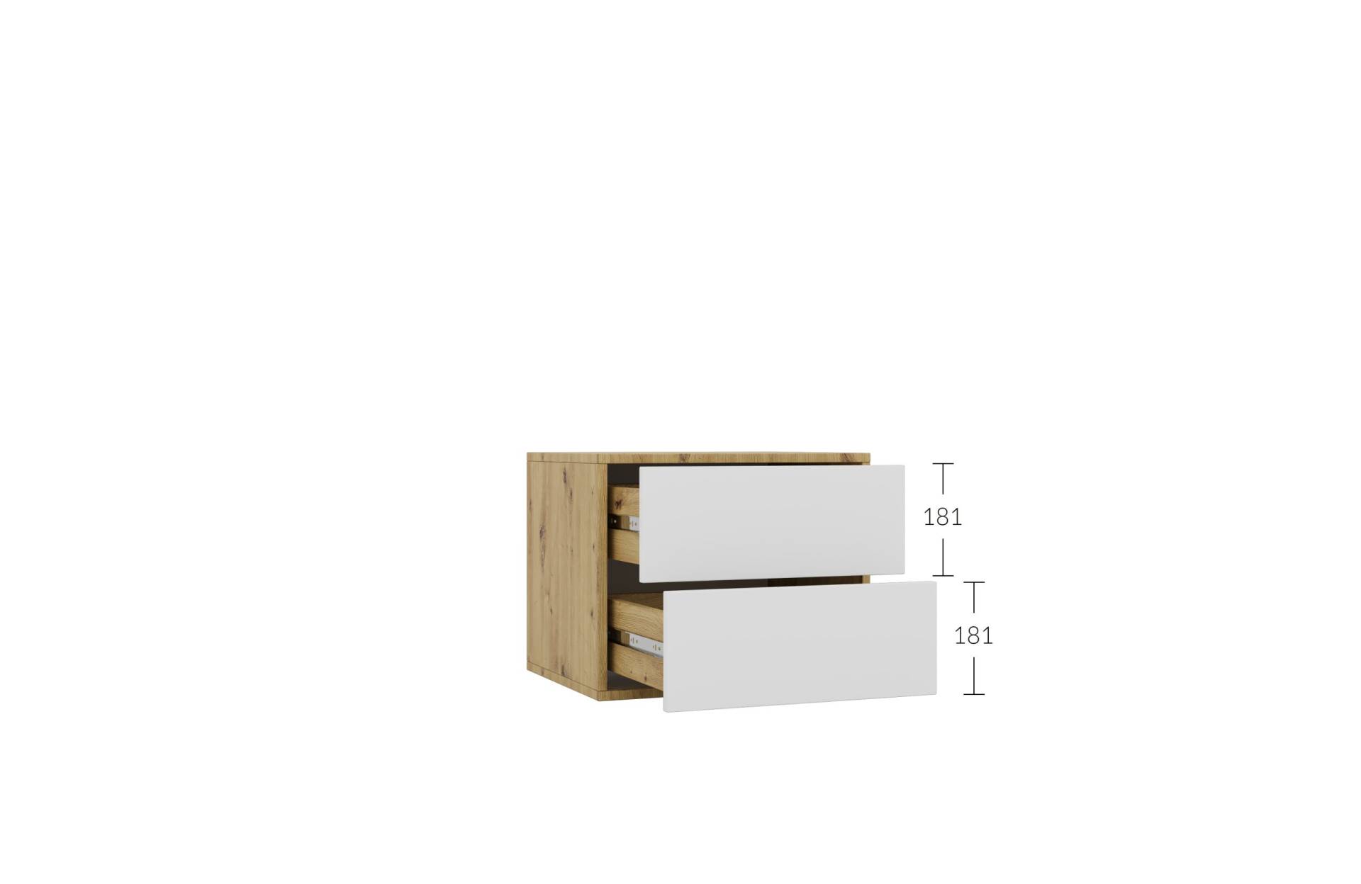 Модель оснащена двумя выдвижными ящиками на телескопических направляющих с системой Push to Open, что позволяет открывать их легким нажатием без использования ручек. Такое решение подчеркивает современный минималистичный вид тумбы и обеспечивает комфорт в повседневном использовании.